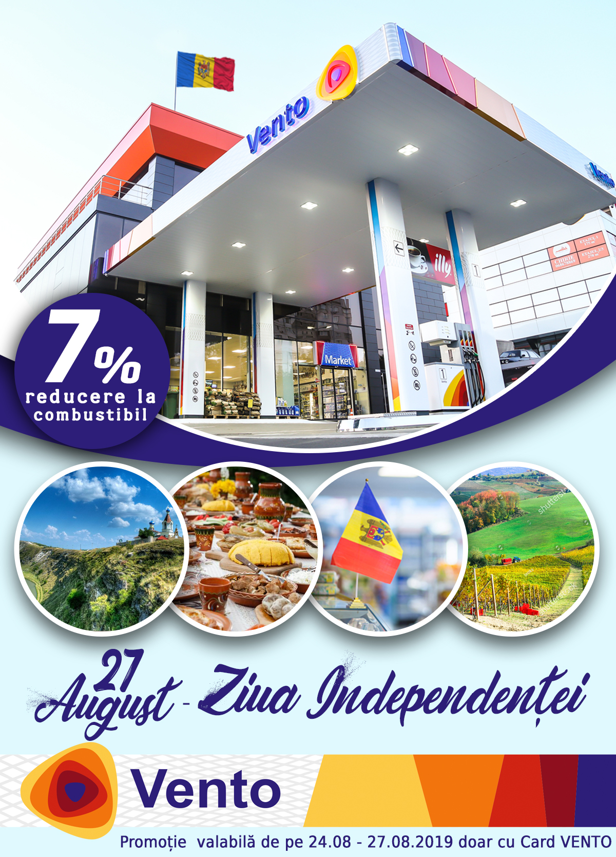 Cu ocazia împlinirii a 28 ani de Independentă, Vento îți oferă 7% reducere la carburanți. Oferta valabilă din 24.08.2019 pînă pe 27.08.2019 doar cu Card Vento.
