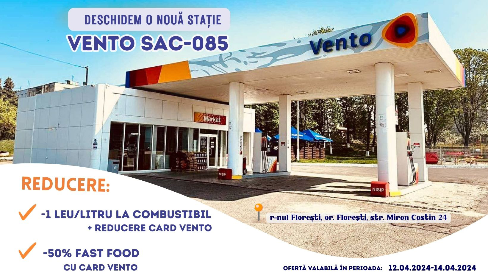 12.04.2024 – deschidem o nouă stație: #VENTO SAC-086, r-nul Florești, or. Florești, str. Miron Costin 24. Am pregătit pentru tine reduceri la: Combustibil -1 leu/litru + Reducerea de pe Card; -50 % la Fast Food (cu Card Vento). Ofertă valabilă în perioada: 12.04.2024-14.04.2024. Vă așteptăm cu drag! #Vento_mereu_aproape_mereu_cu_plăcere