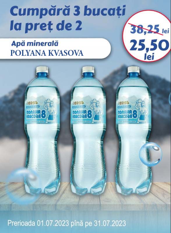 Vino la VENTO și hidratează-te cu apa minerală POLYANA KVASOVA acum la super ofertă : cumpără 3 sticle de 0,5l la un preț special de 25,50lei.