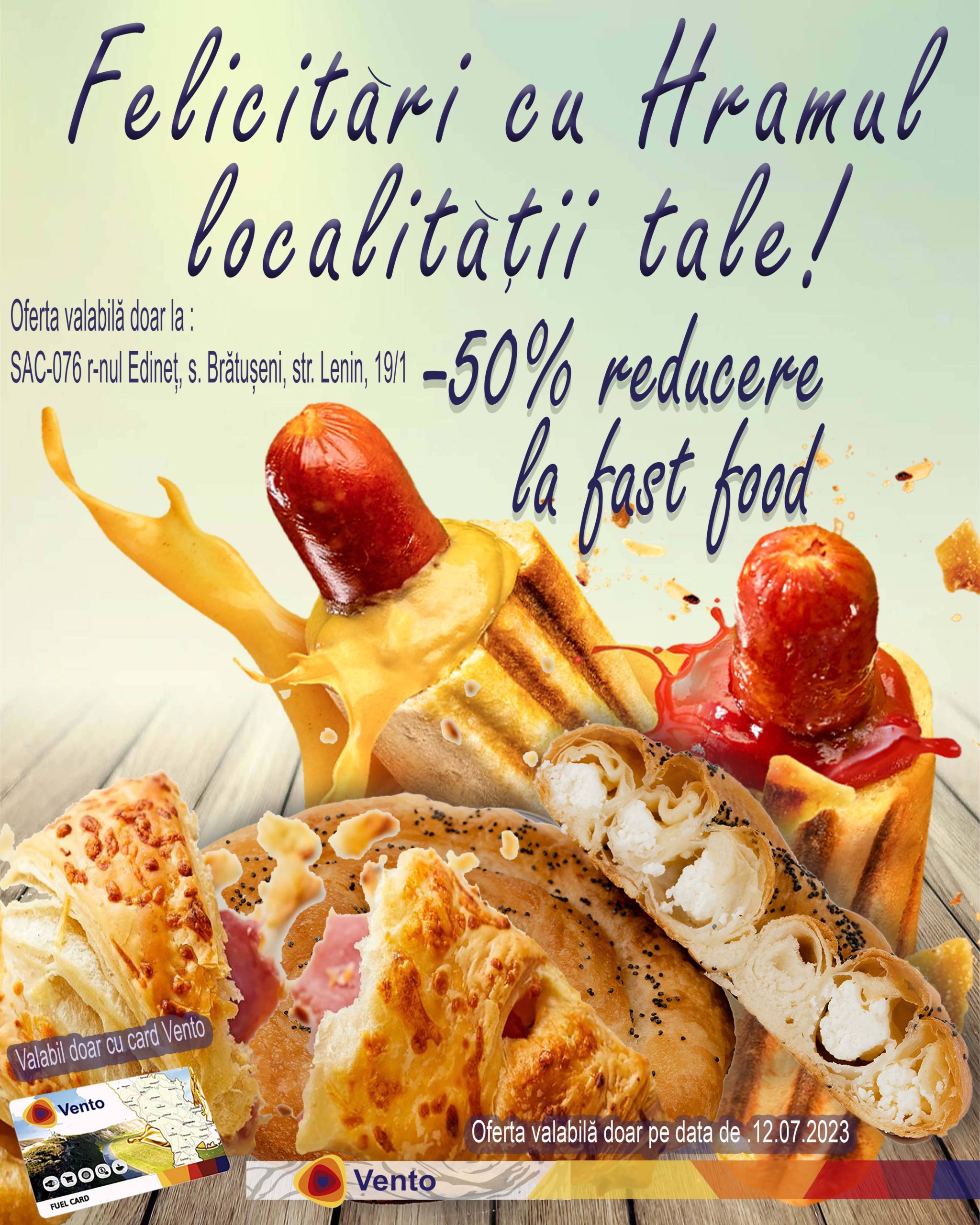 La mulți ani Brătușeni! Vă oferim o reducere de -50% la hot dog, placinte și croissant.