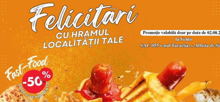 Vento te Felicită cu Hramul localității tale! Suntem bucuroși să celebrăm împreună această zi, oferindu-vă -50% reducere la plăcinte, hot-dog și croissante! Vă așteptăm cu drag, să sărbătorim cu POFTĂ! Ofertă valabilă doar pe 02.08.2024 la Vento: SAC-055, r-nul Taraclia, s. Albota de Sus. * Valabil doar cu Card Vento. #Vento_mereu_aproape_mereu_cu_plăcere
