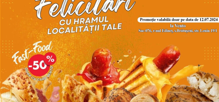 Vento te Felicită cu Hramul localității tale! Suntem bucuroși să celebrăm împreună această zi, oferindu-vă -50% reducere la plăcinte, hot-dog și croissante! Vă așteptăm cu drag, să sărbătorim cu POFTĂ! Ofertă valabilă doar pe 12.07.2024 la Vento SAC-076, r-nul Edineț, s. Bratușeni, str. Lenin 19/1. * Valabil doar cu Card Vento. #Vento_mereu_aproape_mereu_cu_plăcere
