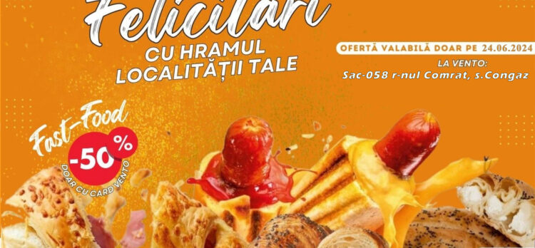 Vento te Felicită cu Hramul localității tale! Suntem bucuroși să celebrăm împreună această zi, oferindu-vă -50% reducere la plăcinte, hot-dog și croissante! Vă așteptăm cu drag, să sărbătorim cu POFTĂ! Ofertă valabilă doar pe 24.06.2024 la Vento SAC-058 r-nul Comrat, s.Congaz. * Valabil doar cu Card Vento. #Vento_mereu_aproape_mereu_cu_plăcere