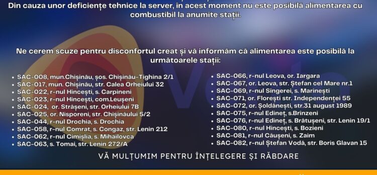 Stimați clienți, Din cauza unor deficiențe tehnice la server, în acest moment nu este posibilă alimentarea cu combustibil la anumite stații. Ne cerem scuze pentru disconfortul creat și vă informăm că alimentarea este posibilă la următoarele stații: SAC-008, mun.Chișinău, șos. Chișinău-Tighina 2/1; SAC-017, mun. Chișinău, str. Calea Orheiului 32 ; SAC-022, r-nul Hîncești, s. Carpineni; […]