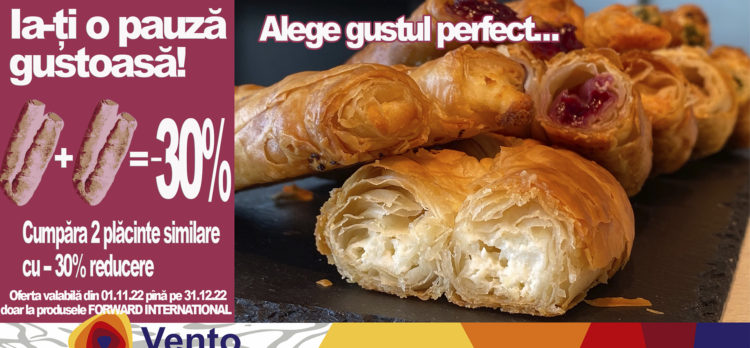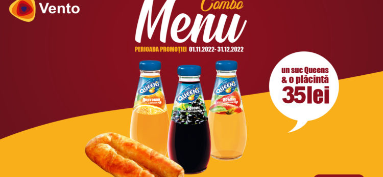 Savurează pauzele la Vento,cu noul #Meniu_Combo: suc queen’s+ o plăcintă la alegere forward la un super preț! Gustul hrănitor care te răsplătește cu o doză de energie pentru un start fresh. Promoţie valabilă din 01.11.2022 pînă pe 31.12.2022 (inclusiv) în limita stocului disponibil!