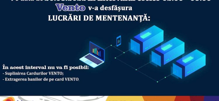 Stimați clienți, pe data de 20.08.2022 în intervalul orelor 02:00 – 05:00, VENTO v-a desfășura Lucrări de mentenanță!