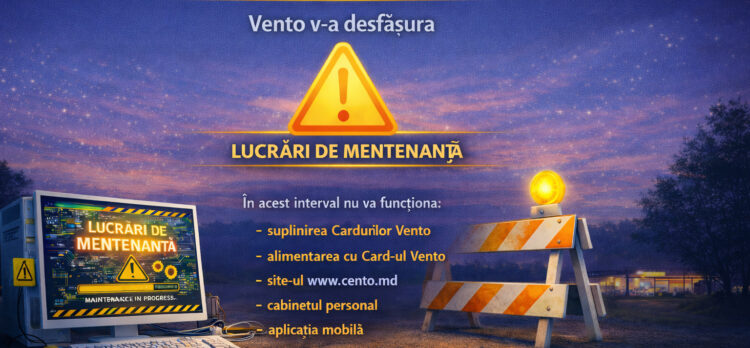 La data de 08.02.2026 în intervalul orelor 01:00 – 06:00 Vento v-a desfășura Lucrări de mentenanță. În acest interval nu va funcționa: – suplinirea Cardurilor Vento – alimentarea cu Card-ul Vento – site-ul www.vento.md – cabinetul personal – aplicația mobilă Vă mulțumim pentru înțelegere!