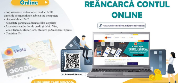 Reâncarcă Contul Cardului de Combustibil #Vento ONLINE – simplu, sigur și comod: – Accesează www.vento-moldova.md; – Cabinet Personal; – Autentificare; – Suplinire Cont; – Introdu datele cardului bancar. Cu #Vento – economisești Timp și Bani!