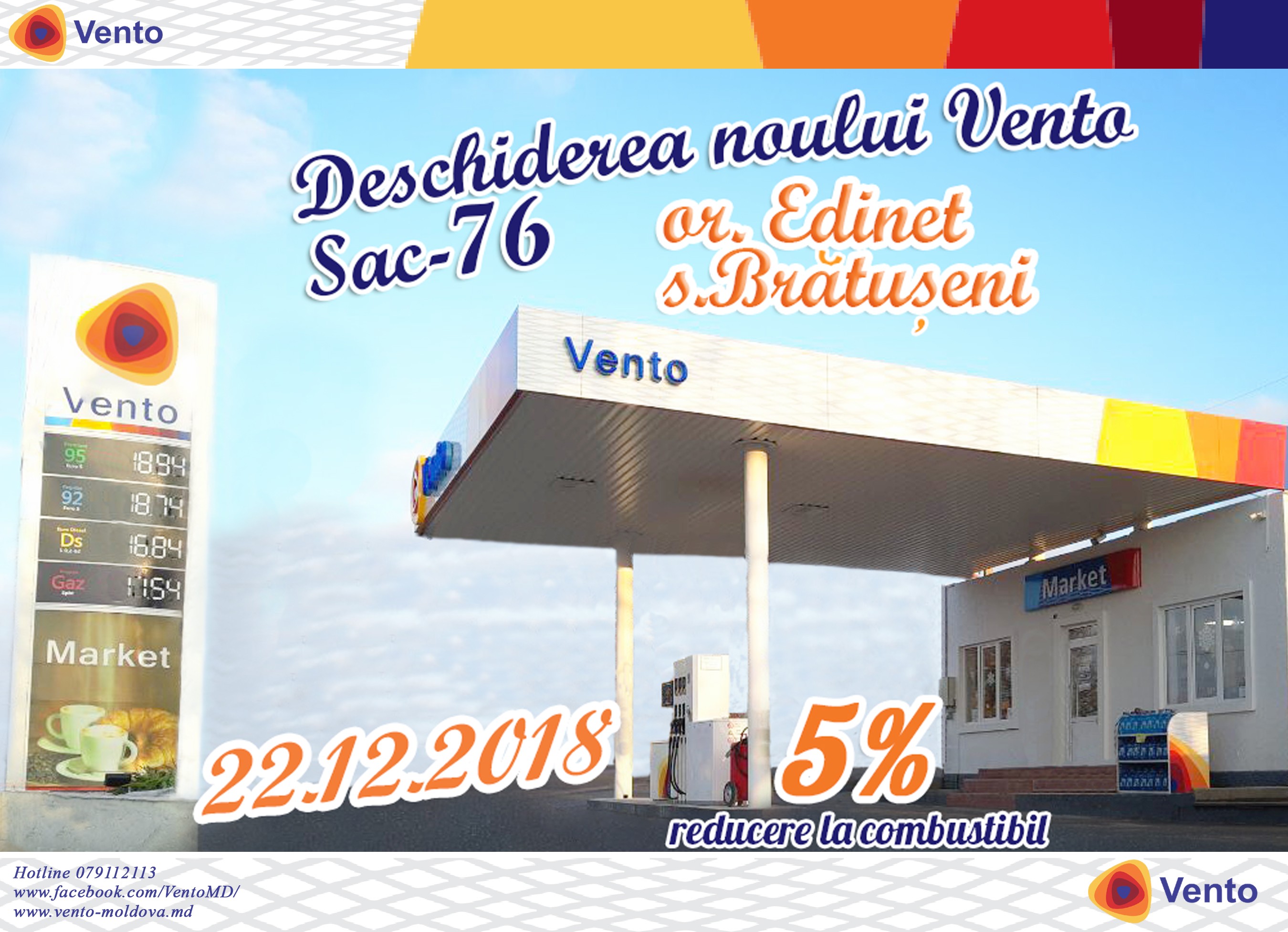 22.12.2018 - Vino și tu la deschiderea noului Vento Sac-76 or. Edineț, s. Brătușeni, și profită de 5% reducere la carburanți!!