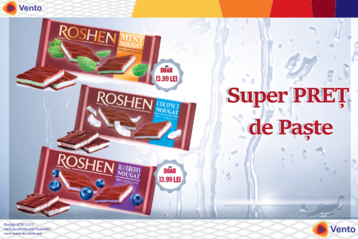 Savurează gustul desăvîrșit al ciocolatei ROSHEN, la super preț, acum la Vento-Moldova doar 13,99 lei