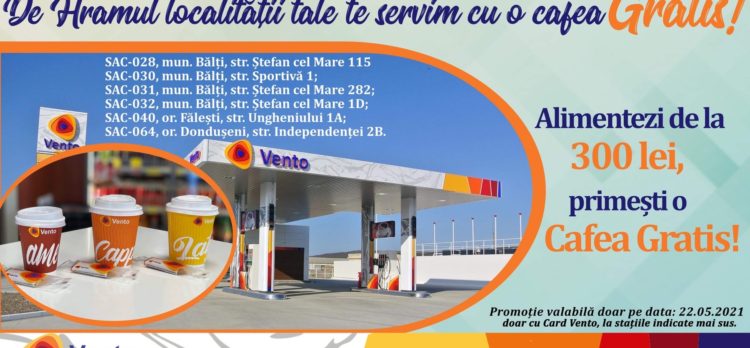 🚗⛽️ Ко дню вашего родного города или села мы дарим вам БЕСПЛАТНЫЙ кофе! 🤩☕️ Заправьтесь минимум на 300 лей, и получите в подарок БЕСПЛАТНЫЙ кофе Lavazza ☕️ ♥ ️ Акция действует только 22.05.2021 с картой Vento на указанных ниже АЗС: ⛽️АЗС-28 г. Бельцы, ул. Штефана чел Маре, 115;🚗 ⛽️АЗС-30 г. Бельцы, ул. Спортивная, 1;🚗 ⛽️АЗС-31 […]